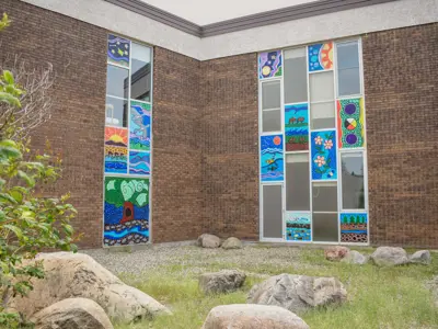 École Holy Cross School partnered with Métis artist Leah Marie Dorion to create a series of vibrant murals installed on the exterior of the school. Leah collaborated closely with staff and students to design and paint the works, guiding them through the artistic process while sharing stories and teachings about Métis culture and history.